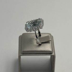 Anello in oro bianco 18K con diamanti di ct. 1,36 e un’acquamarina di ct. 8,84.